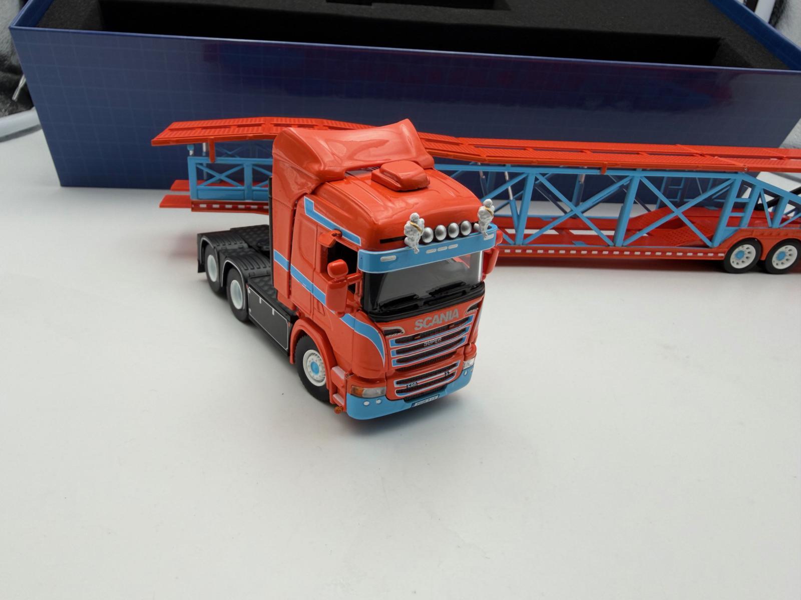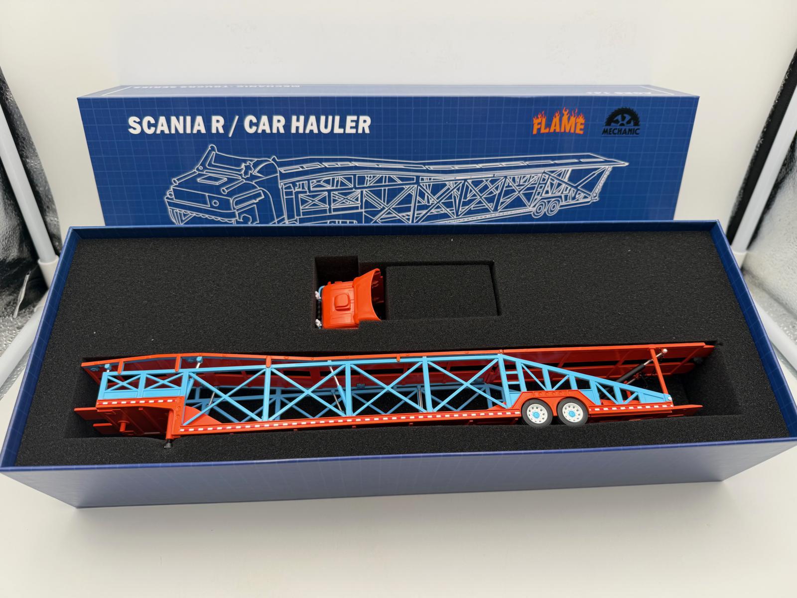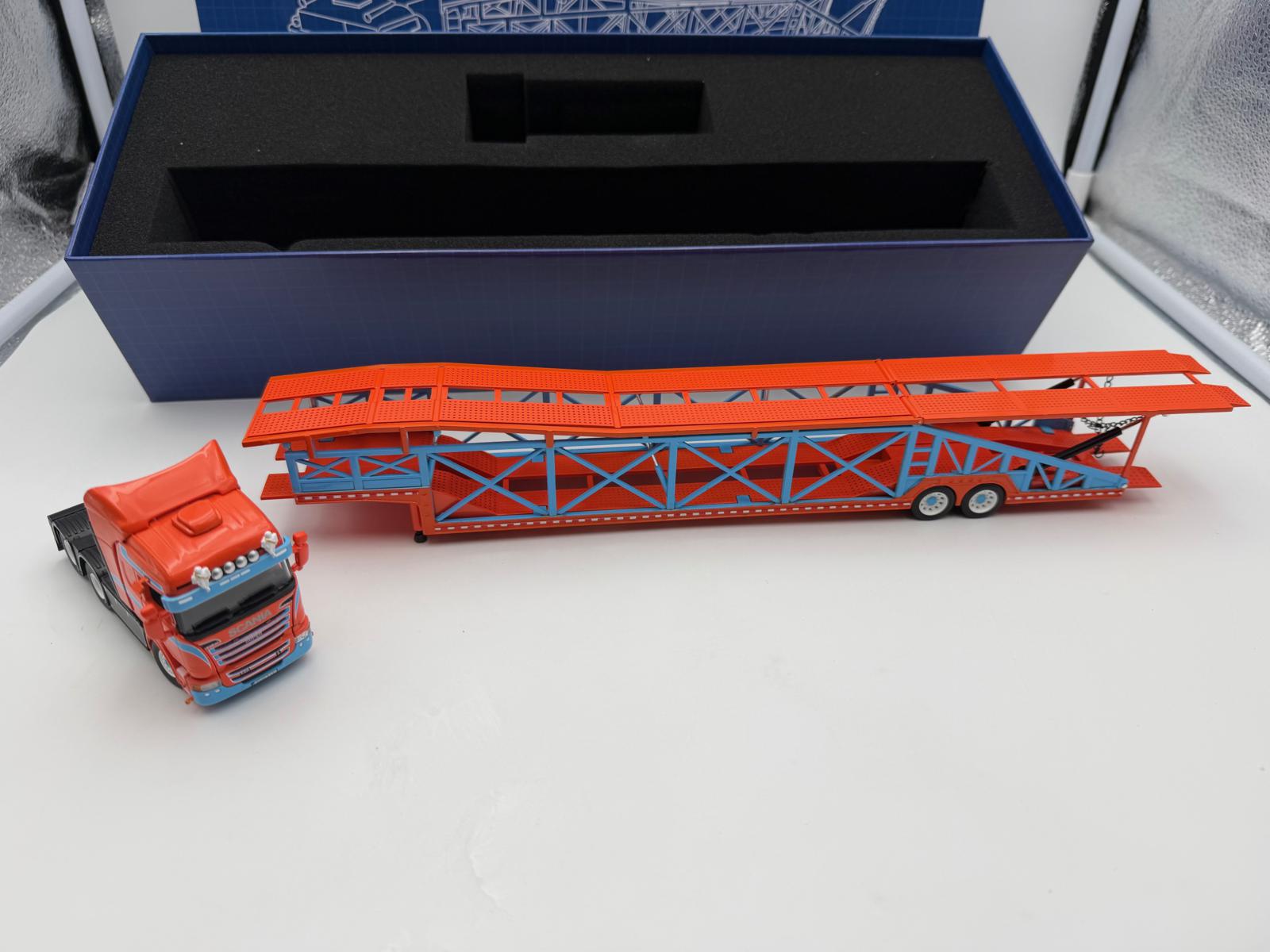 FLAME MODEL 1:64 SCANIA TRANSPORTE DE COCHES NARANJA/AZUL